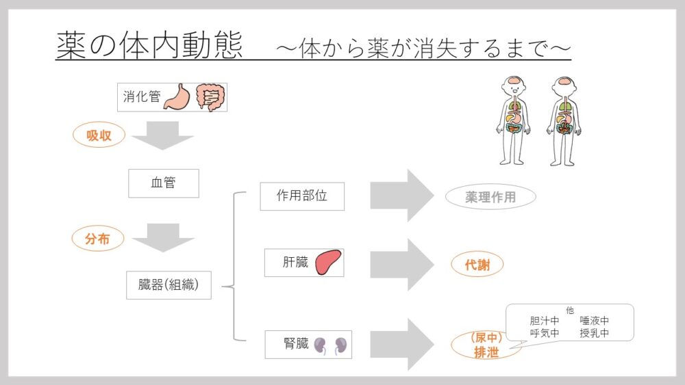 投与された薬物は吸収され全身の組織に分布し、作用部位で薬理作用を発揮します。