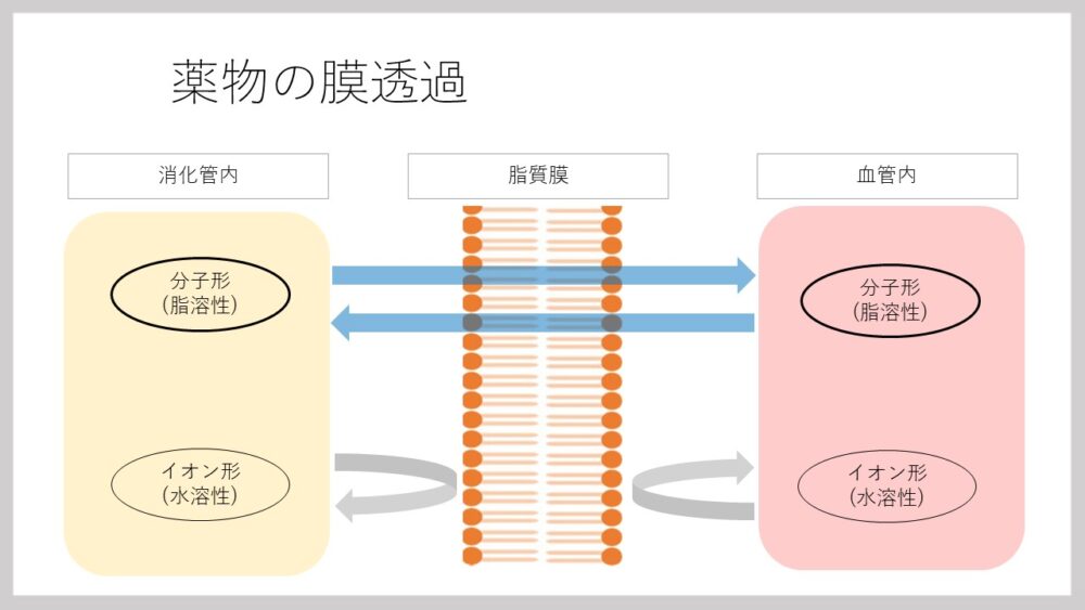 生体膜は脂質の膜で構成されており、薬物は脂溶性の性質を持つとき、すなわち分子型で膜透過が可能となります。