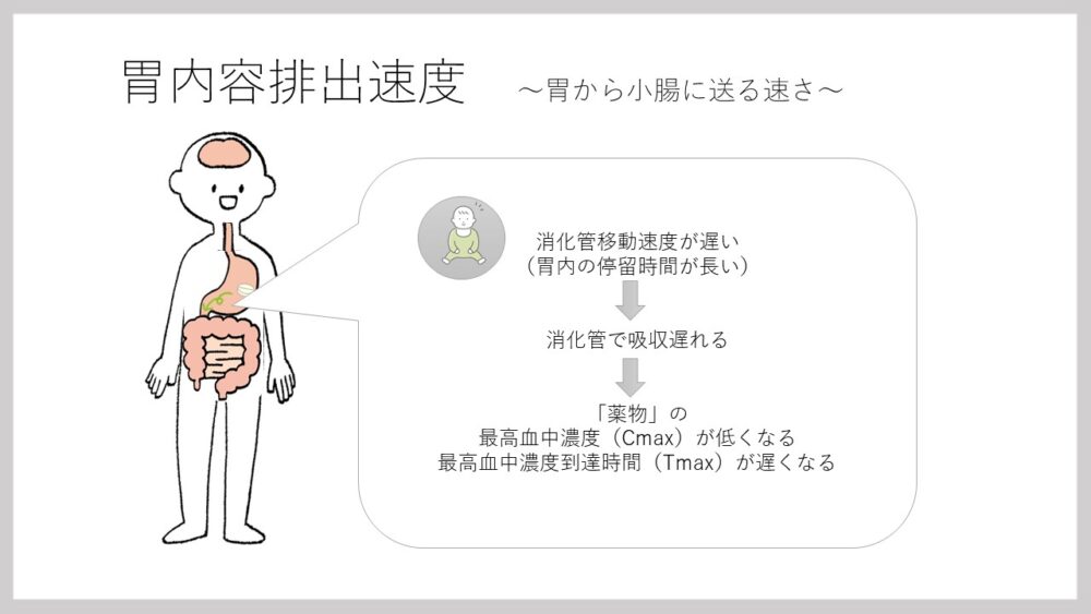 消化管移動速度が遅い、すなわち胃内の停留時間が長いと、「薬物」の最高血中濃度(Cmax)が低くなり、最高血中濃度到達時間(Tmax)が遅くなります。