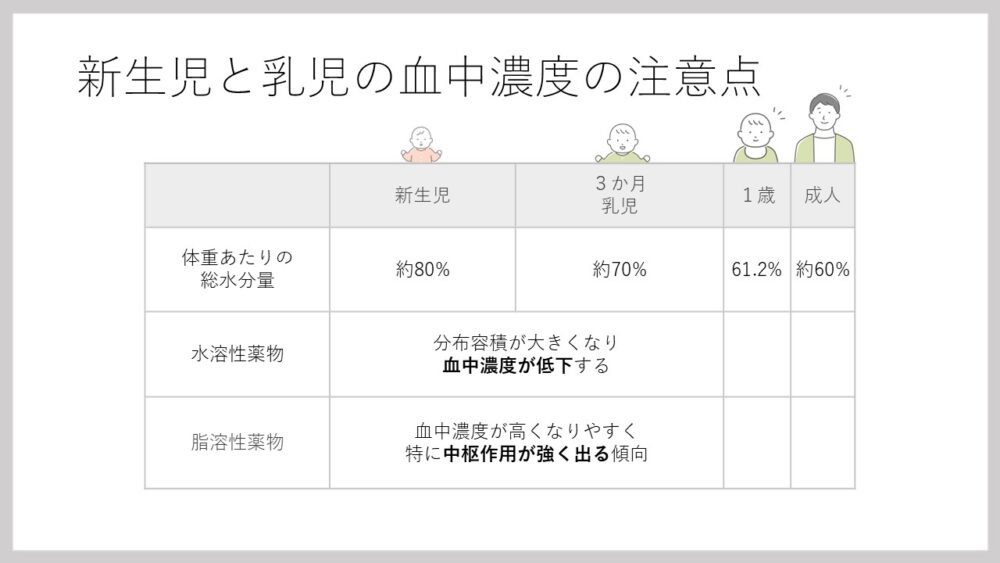 まず、水溶性の薬物は水分量の多い組織に分布するために、新生児、乳児期では分布容積が大きくなり、血中濃度が低下する可能性があります。