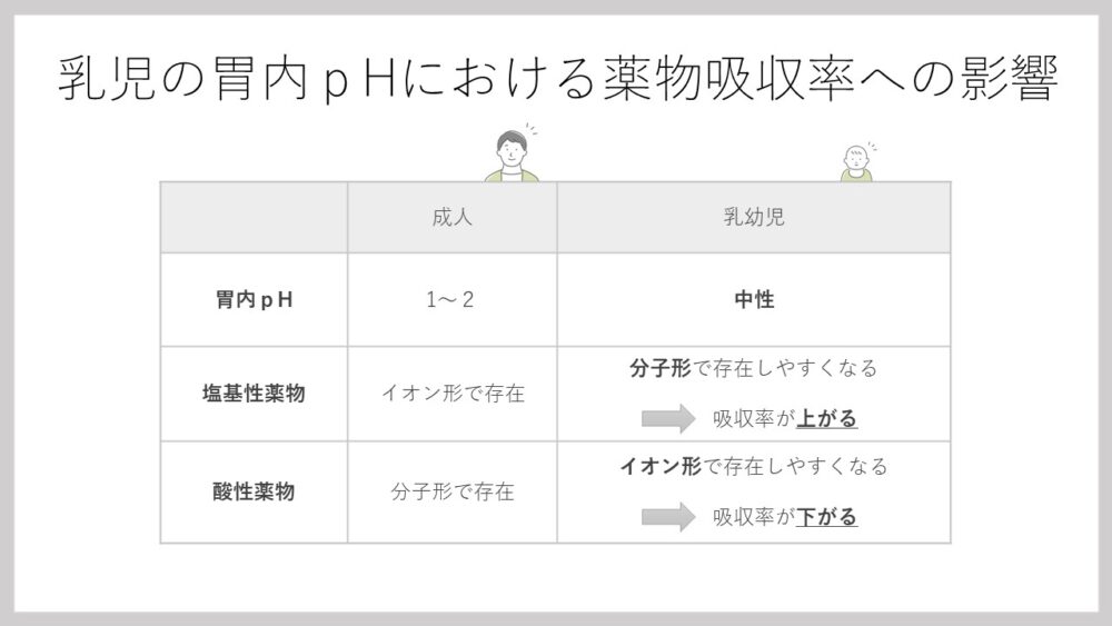 また、乳幼児期は胃内pHが中性と一般より高いため、本来酸に不安定で失活しやすい薬物(例:ペニシリン系抗菌薬、エリスロマイシンエチルコハク酸エステルなど)は安定化、すなわち吸収率は増加する傾向があり、注意が必要となります。