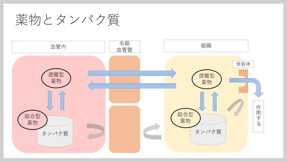 血漿中にはアルブミンなどのタンパク質が存在し、薬物は血中でアルブミンに結合したものと遊離した状態で存在しています。