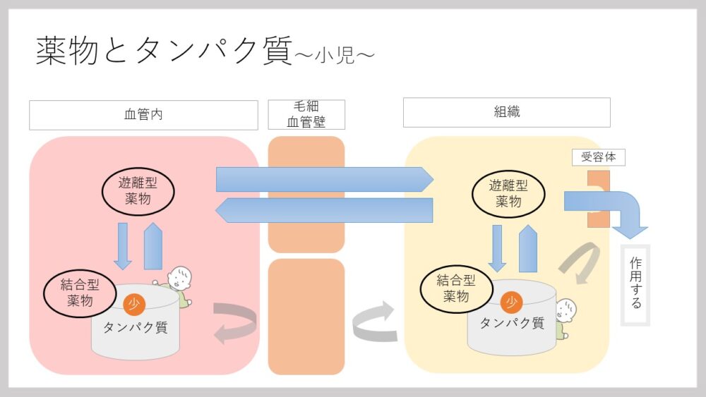 よって生後3歳頃までの小児は成人に比較して、遊離型薬物が増え、組織移行性が促進され、結果として作用が強くなる傾向があります。