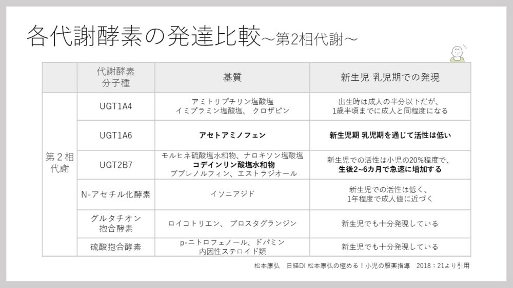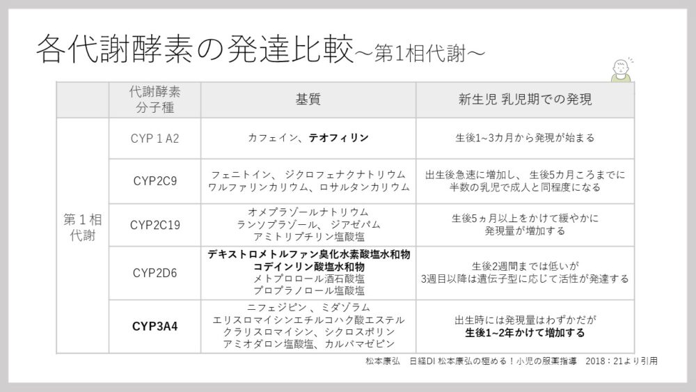 すなわち、代謝酵素の発達は、新生児~乳児期と幼児期以降~学童期では傾向が異なることが知られています。