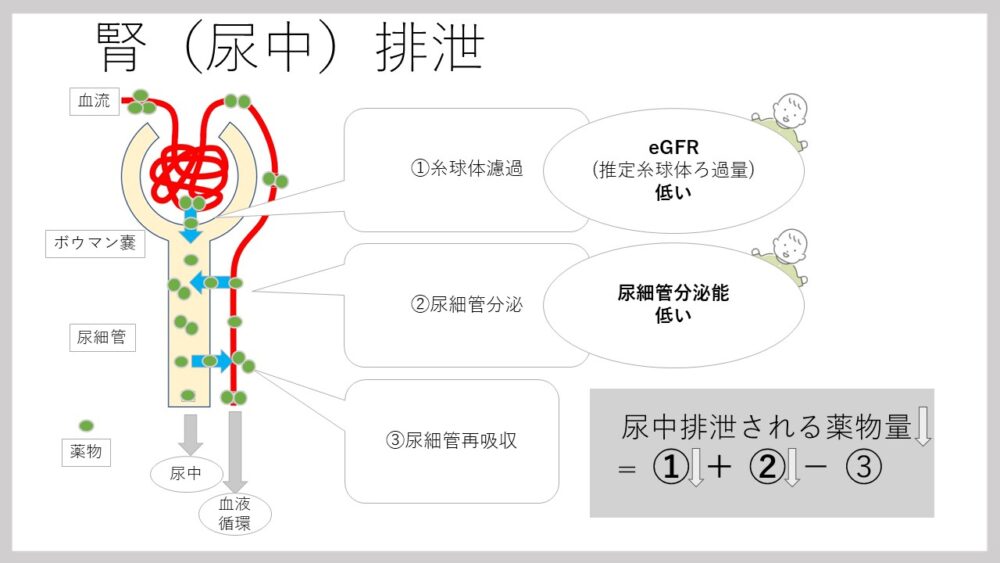 そのため特に、新生児期へ水溶性の腎排泄型の薬物(例:ペニシリン系、セフェム系、アミノグリコシド系の抗菌薬など)を投与すると、排泄の遅延が起こることがあるため、注意が必要です。
